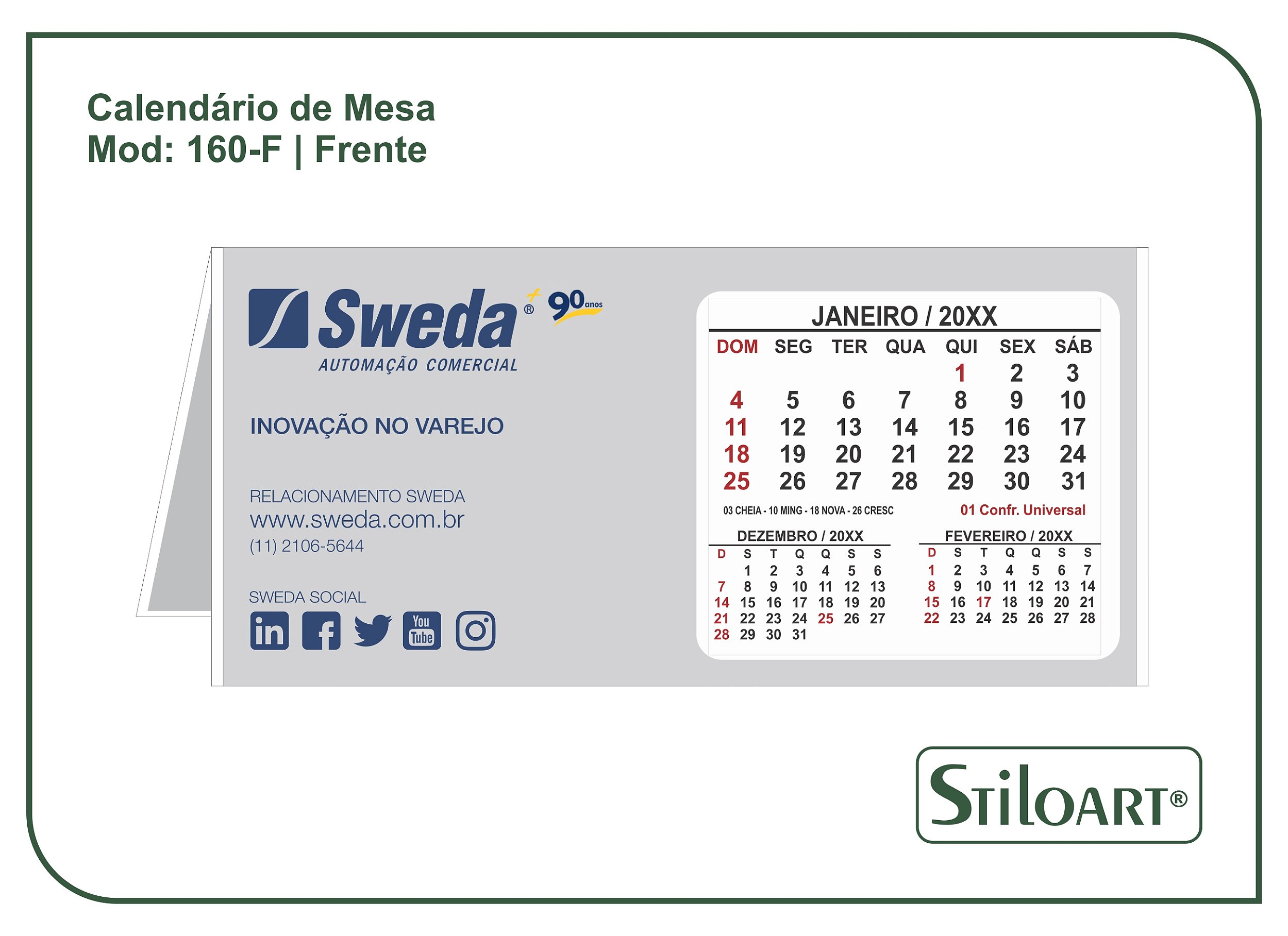 Calendário de Mesa 160-F, produzido em PVC Cristal 0,70 mm. Medidas: 160 x 75 mm.